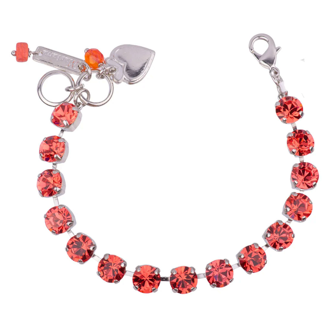 This best-selling Mariana bracelet is easy to wear everyday, or dress up for an evening occasion. It features round cut, medium sized (8.5mm) Padparadscha Swarovski Crystals (542).