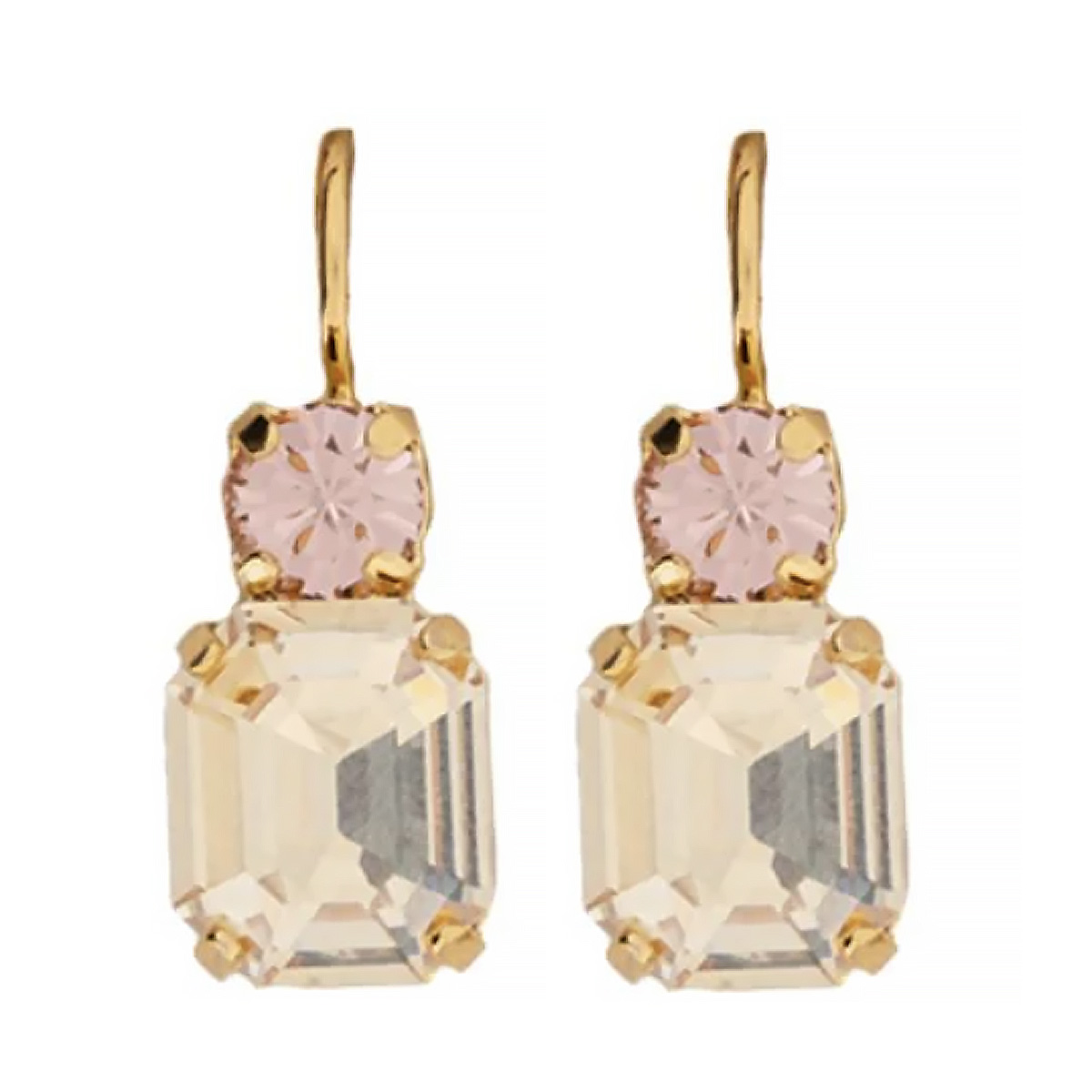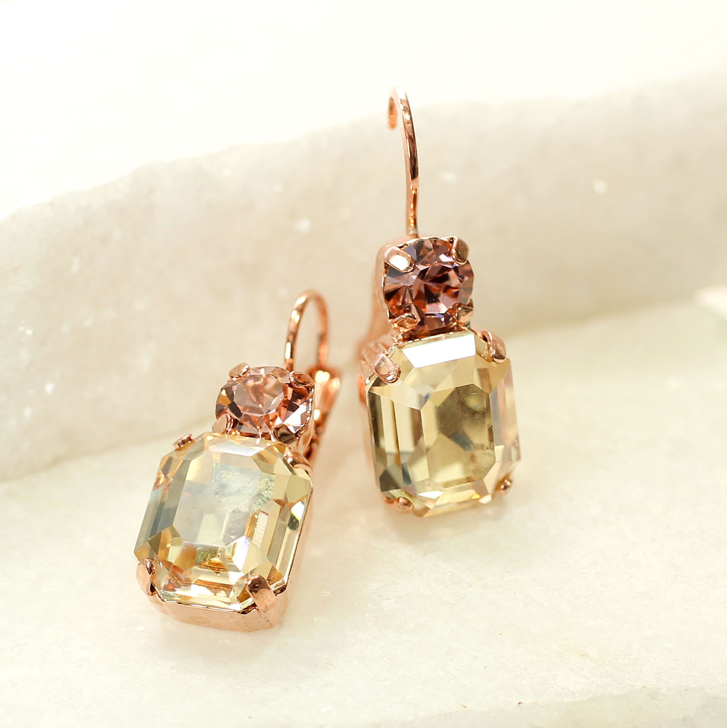 Champagne Kisses Earrings feature a variety of stones such as Swarovski Crystals: Golden Shadow (216), Black Diamond (215) and Vintage Rose (319).