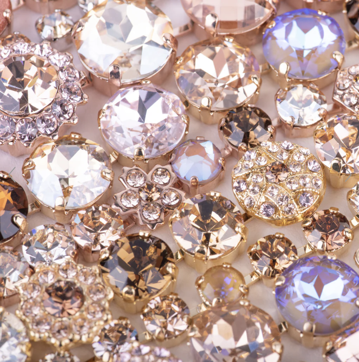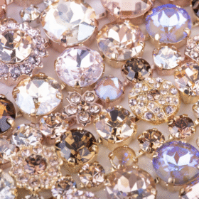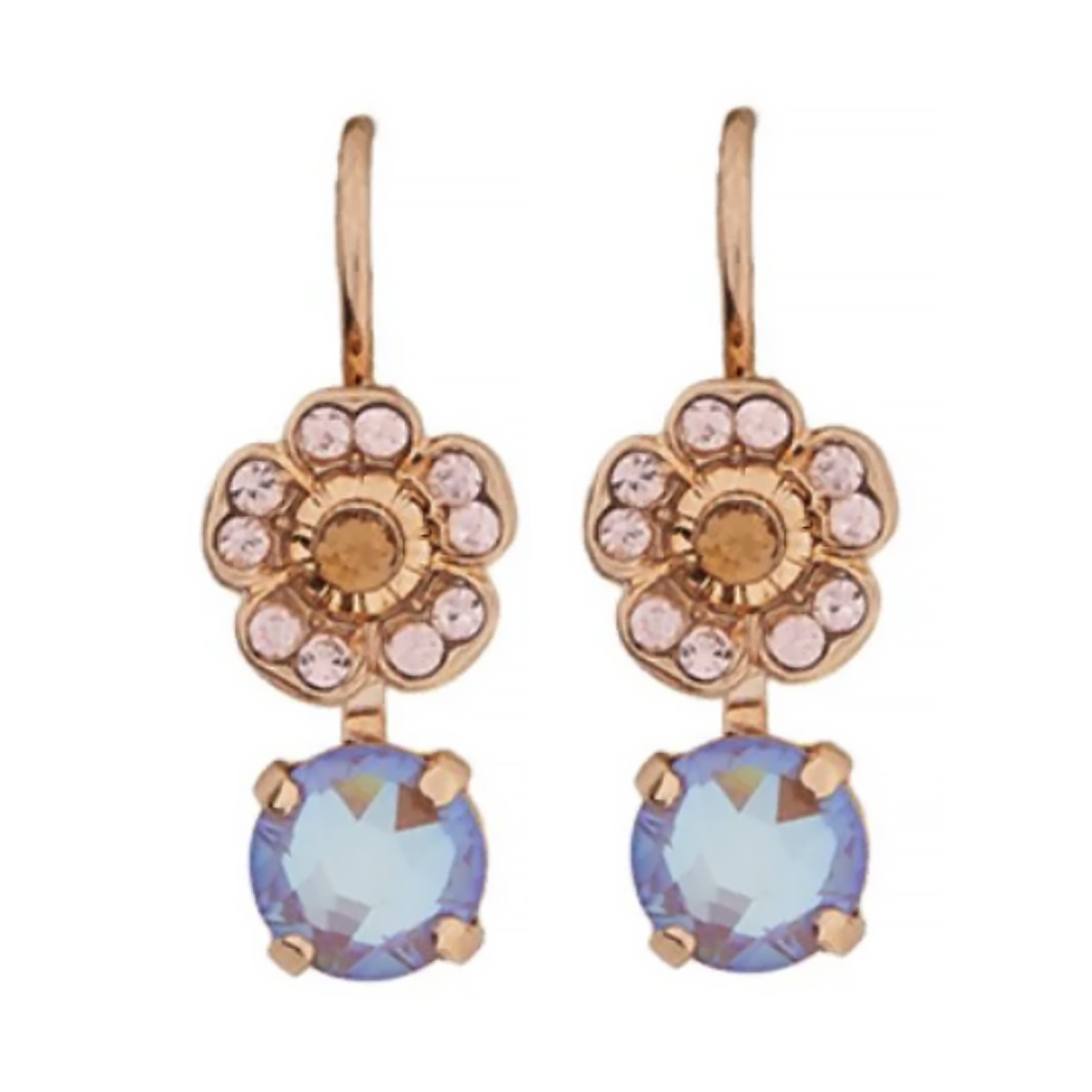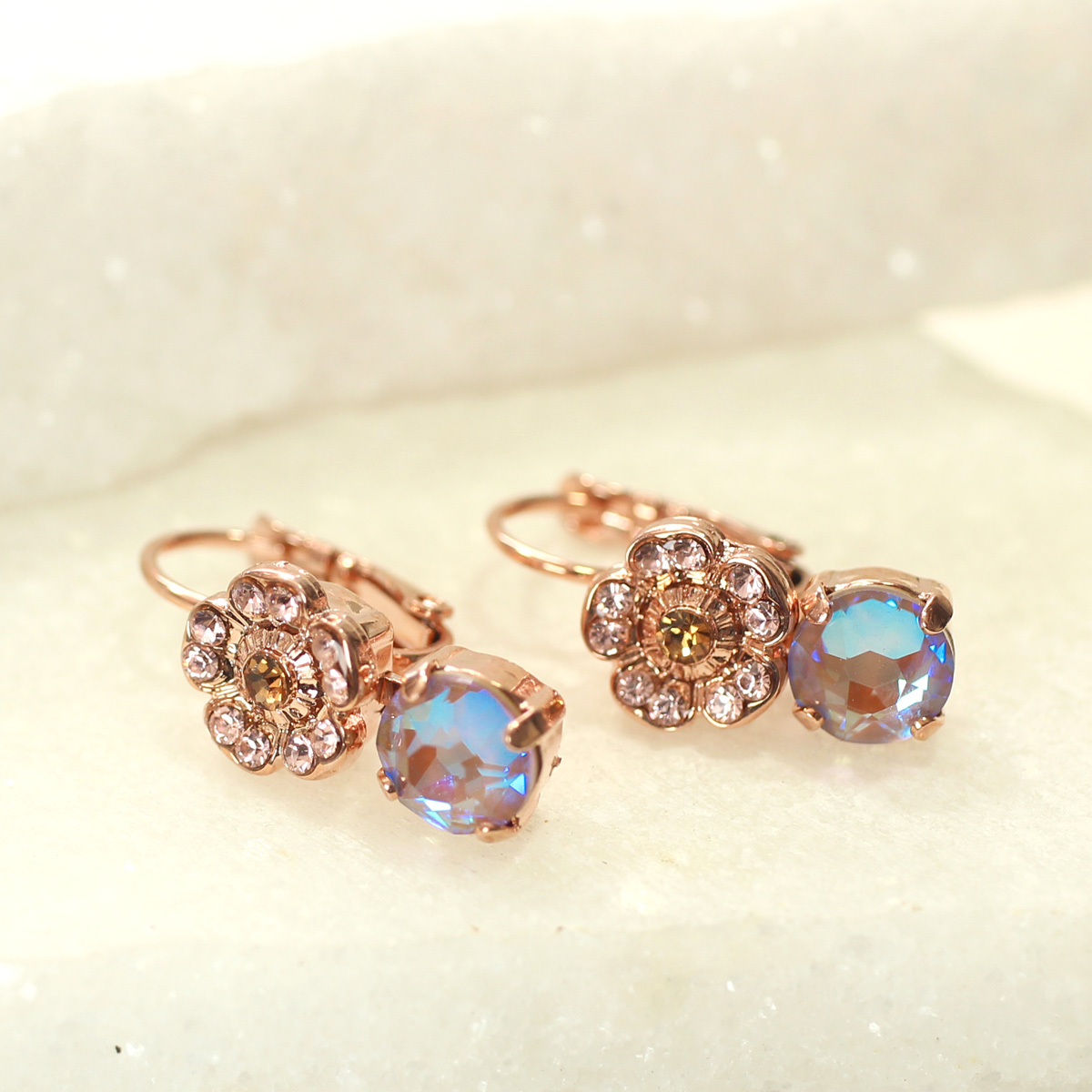 Amaretto earrings feature exquisite Swarovski crystals: Golden Shadow (216), Light Colorado Topaz (246), Champagne (362), Silk (391) and Smoked Topaz (246).
