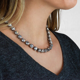 Countdown Gown Necklaces feature a variety of stones such as Swarovski Crystals: Sapphire (206), Montana (207), Indian Sapphire (217) and Indicolite (379). Easy to wear French Hook.