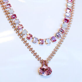 My Treasures necklaces feature exquisite Swarovski crystals and pearls. Some with hand cut gemstones and layered in 18ct Rose Gold or Silver (Rhodium).